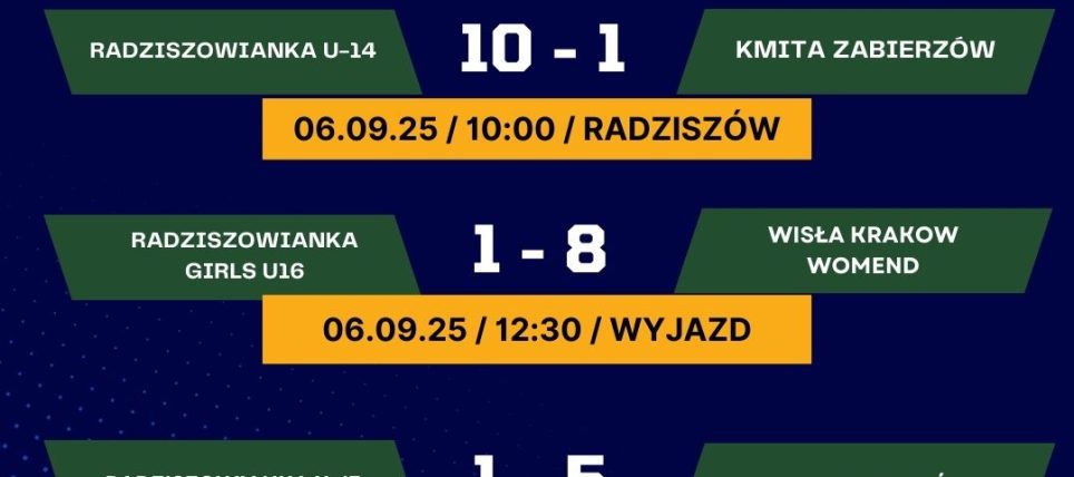 Radziszowianka Trampkarz Starszy- U-15 W drugim meczu ligowym nasi trampkarze urządzili sobie trening strzelecki wygrywając aż 10-0 z gospodarzami Victorią Kraków  Oczywiście po takim meczu można pochwalić każdego, od obrony, razem z bramkarzem ale szczególnie zawodników ofensywnych naszej drużyny – brawo chłopcy   10.09.2025  17:30  Kraków, Babińskiego  1 liga okręgowa  Victoria Kraków Victoria Kraków –
