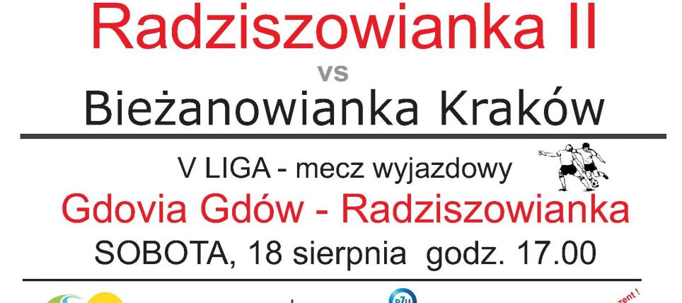 Radziszów 19.08.2018. Godzina 17.0 Bramki: Tomek Kozik 12, Mariusz Malysa 47, Kuba Tryniszewski 50 Skład: D. Maślak, M. Baran, R. Kakol, L. Mazurkiewicz, P. Banach, B. Chowaniec, D. Malysa, M. Malysa, T. Kozik, M. Okarmus, J. Tryniszewski