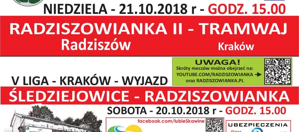 Śledziejowice 20.10.2018, godzina 15.00 Skład: Sergey Mikhailov, Bartek Baliga, Marek Wcisło ( ’75 Michał Dziobek), Maciek Grzesik, Grzesiek Kościelniak (’65 Kuba Karaś), Maciej Zięcik (’52 Tomek Pakosz), Paweł Paciorek (’65 Sebastian Romek), Paweł Sosin, Marcin Bierówka, Marcin Sosin (’52 Wiktor Piwowarczyk), Dawid Węgrzyn. Radziszowianka nie poradziła sobie w dzisiejsze popołudnie z beniaminkiem klasy okręgowej – drużyną Śledziejowic. Graliśmy
