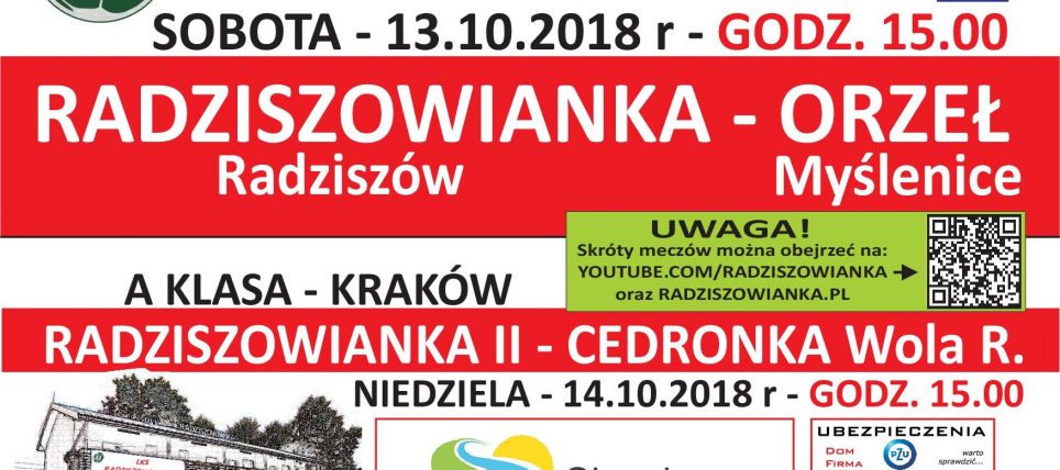 Radziszów 13.10.2018, godzina 15.00 Bramki – Wiktor Piwowarczyk 15′, Marcin Sosin ’ 56, Dawid Węgrzyn 59′ Skład: Mateusz Toporowski, Tomek Baliga, Wiktor Piwowarczyk (’65 Karol Kurek), Bartek Baliga, Rafał Wasyl, Michał Dziobek, Maciej Zięcik (’72 Paweł Paciorek), Paweł Sosin, Piotrek Banach (’46 Tomek Pakosz), Marcin Sosin (’80 Michał Budek), Dawid Węgrzyn. www.gminaskawina.pl