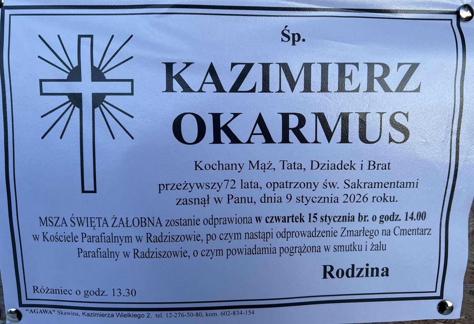 Uroczystości pogrzebowe odbędą się w kościele parafialnym w Radziszowie w czwartek, 15 stycznia